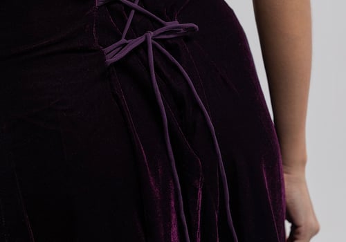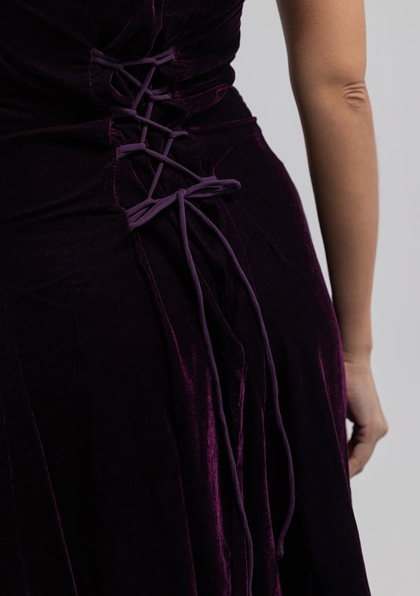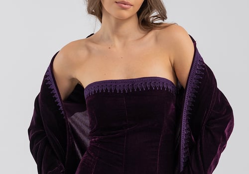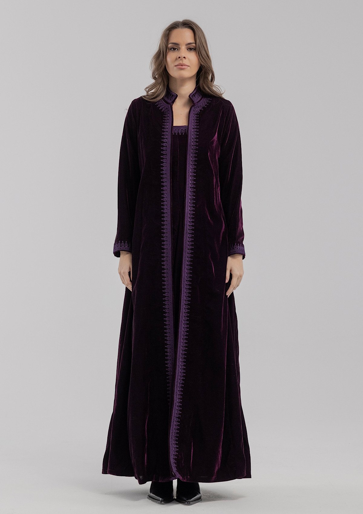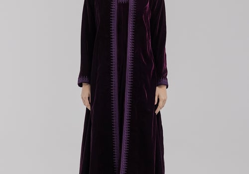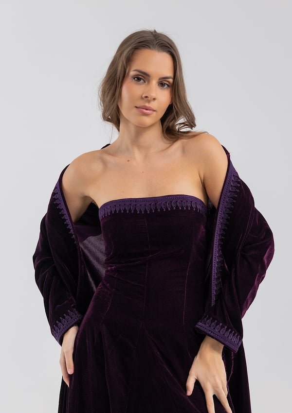 A purple velvet kaftan featuring traditional Moroccan-style embroidery, paired with a matching velvet inner dress.