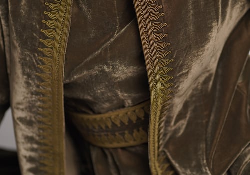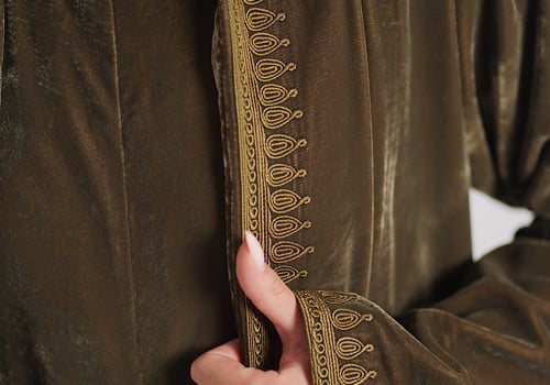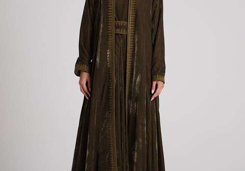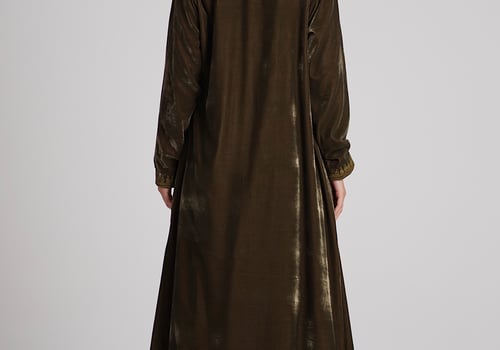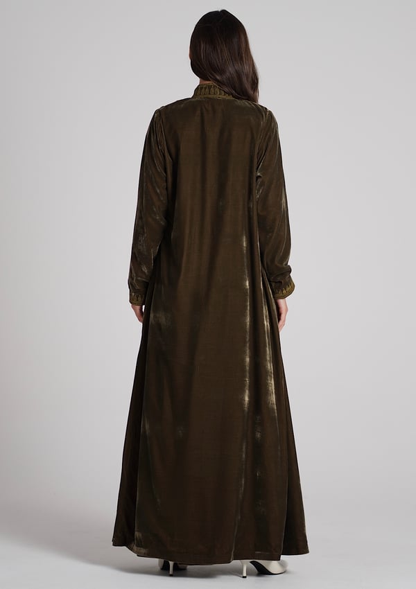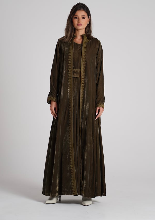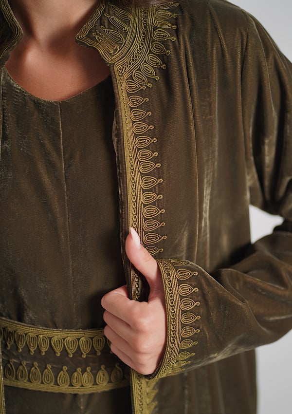 An olive velvet kaftan featuring traditional Moroccan-style embroidery, paired with a matching velvet inner dress. The model is wearing size Small with a length of 55
