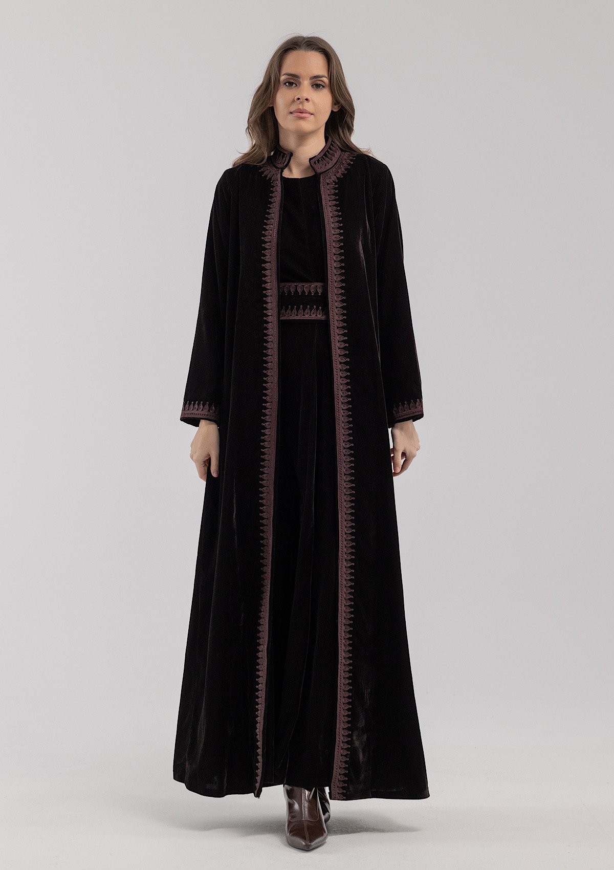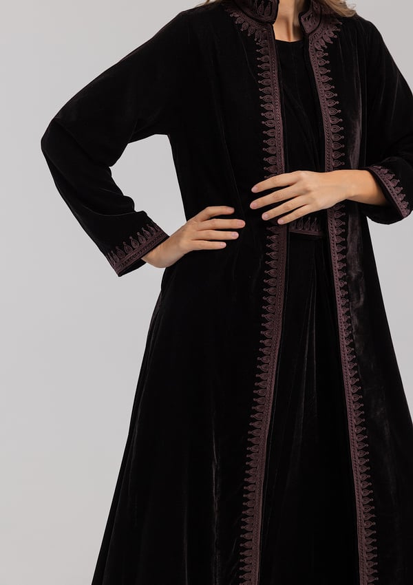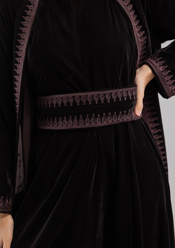 A brown velvet kaftan featuring traditio...