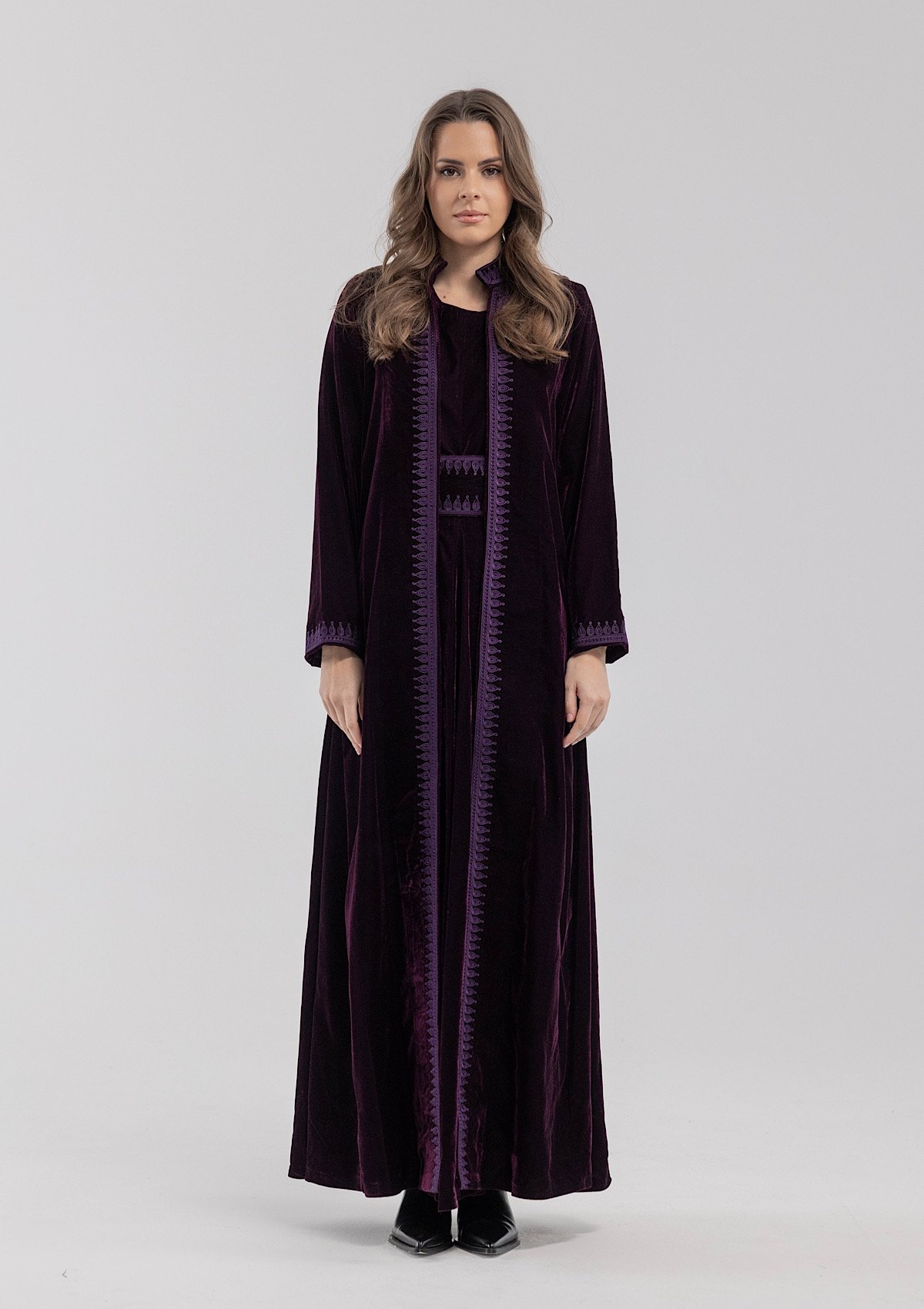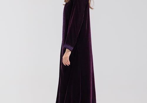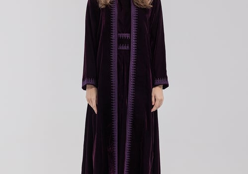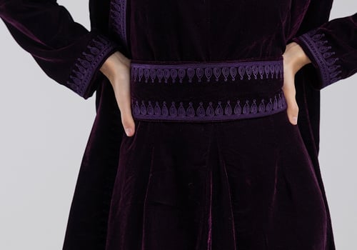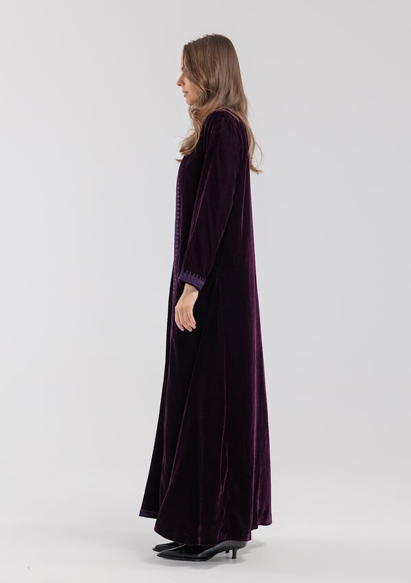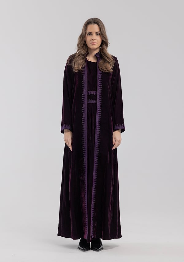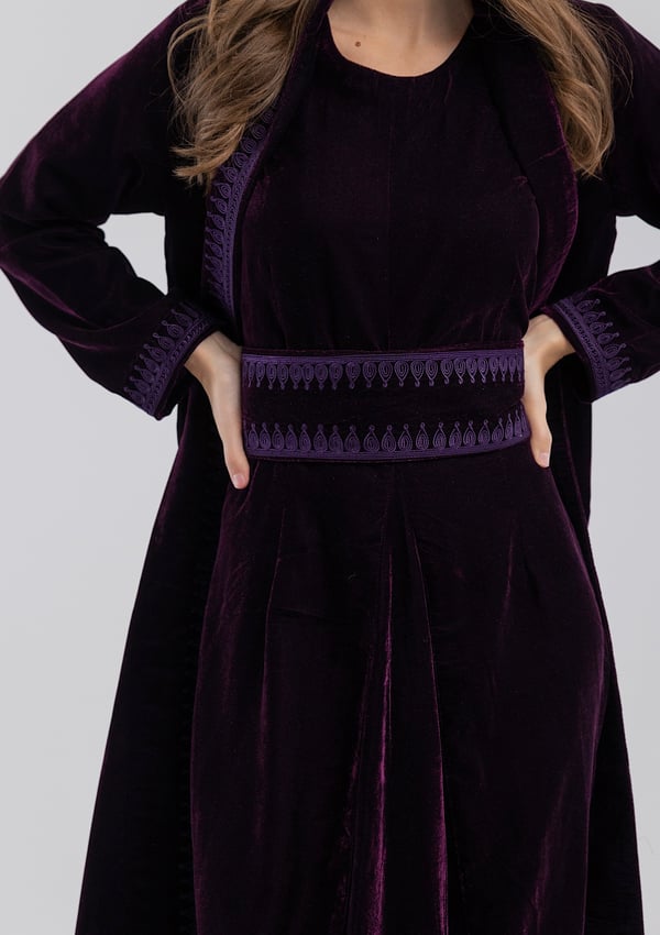 A purple velvet kaftan featuring traditional Moroccan-style embroidery, paired with a matching velvet inner dress.