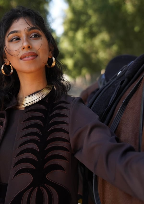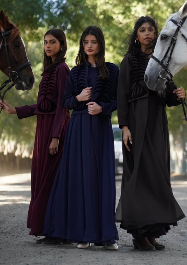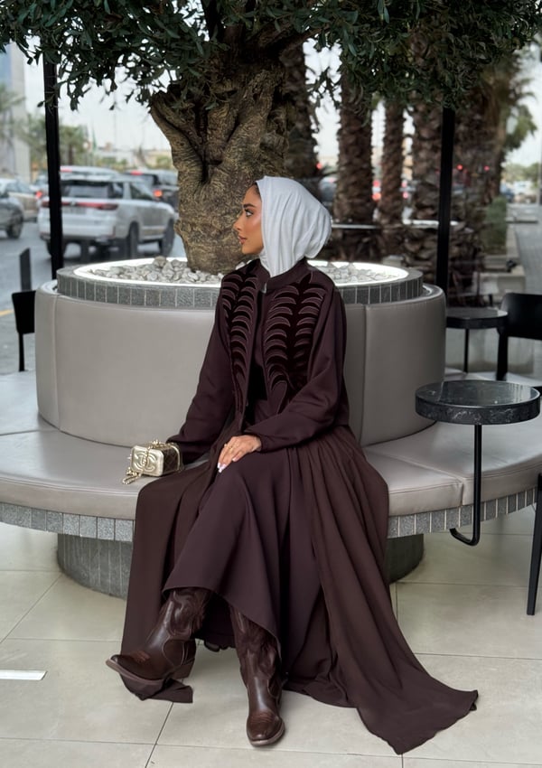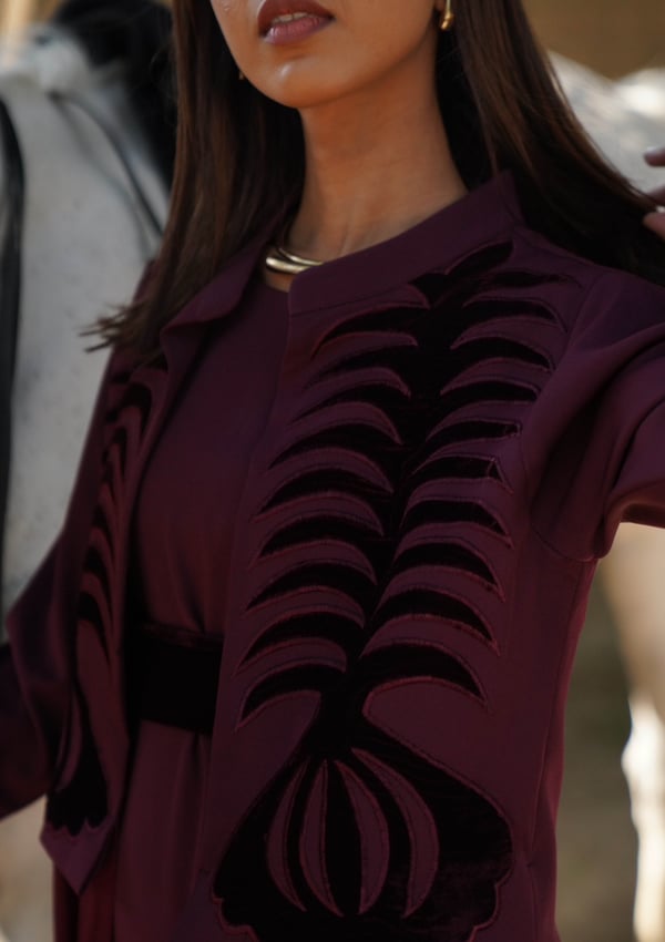 Crepe caftan featuring a crepe jacket embellished with velvet embroidery, attached to chiffon fabric, paired with a crepe dress.