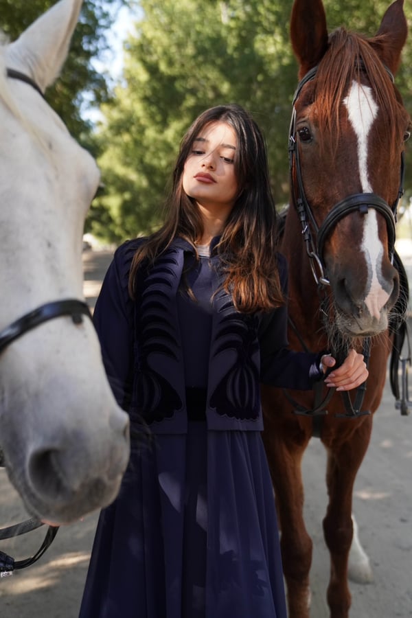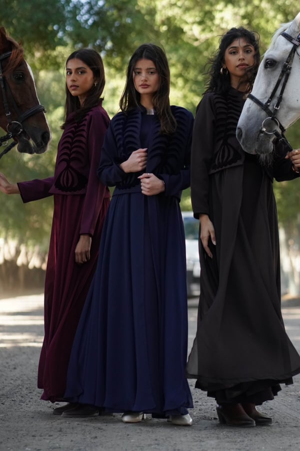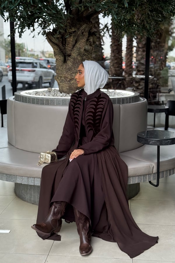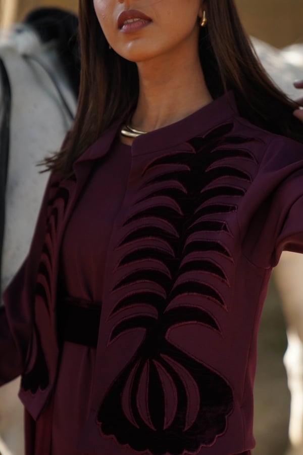 Crepe caftan featuring a crepe jacket embellished with velvet embroidery, attached to chiffon fabric, paired with a crepe dress.