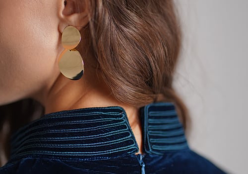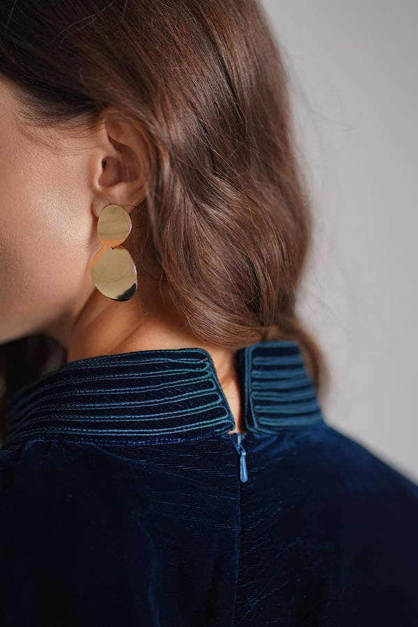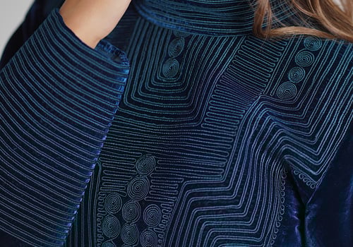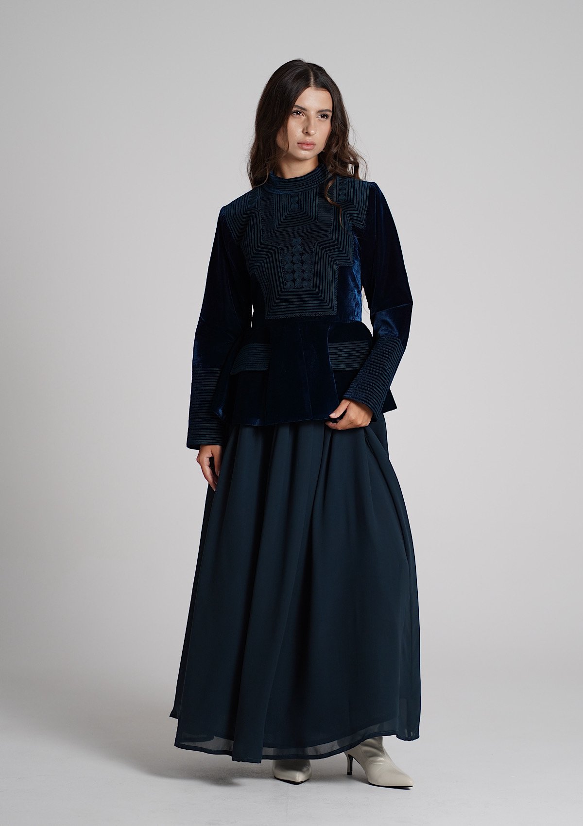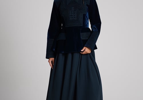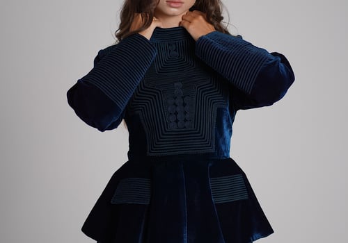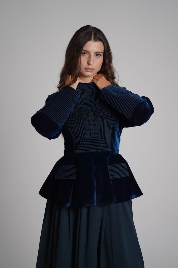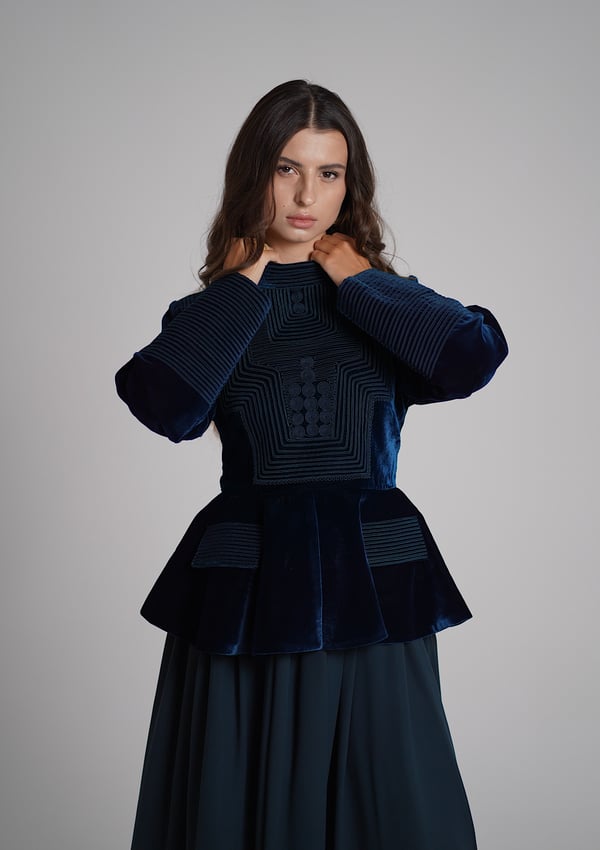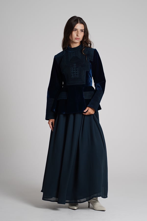 A turquoise set featuring an embroidered velvet top paired with a lightweight chiffon skirt.