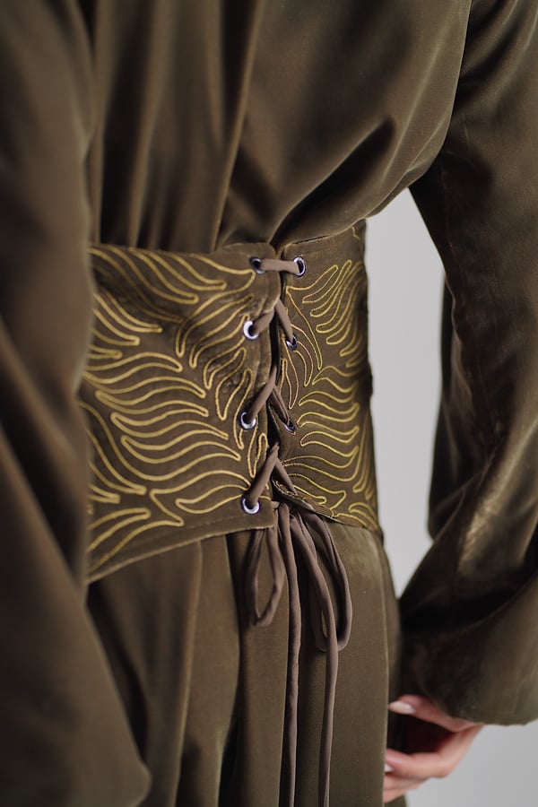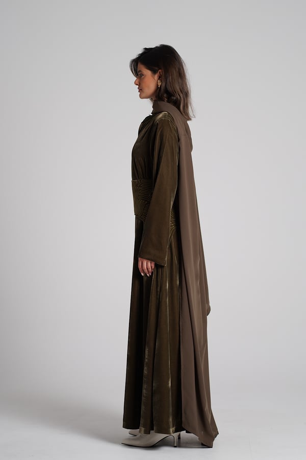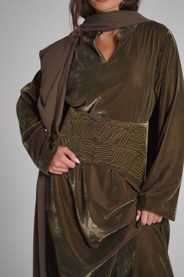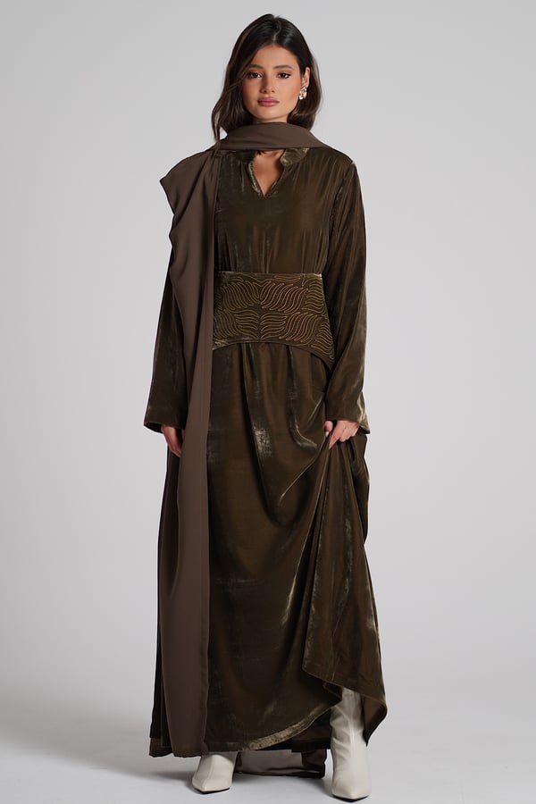 Velvet kaftan with an embroidered belt and a chiffon bisht.