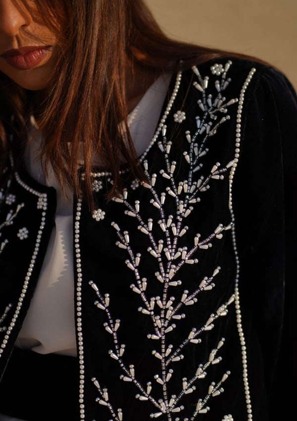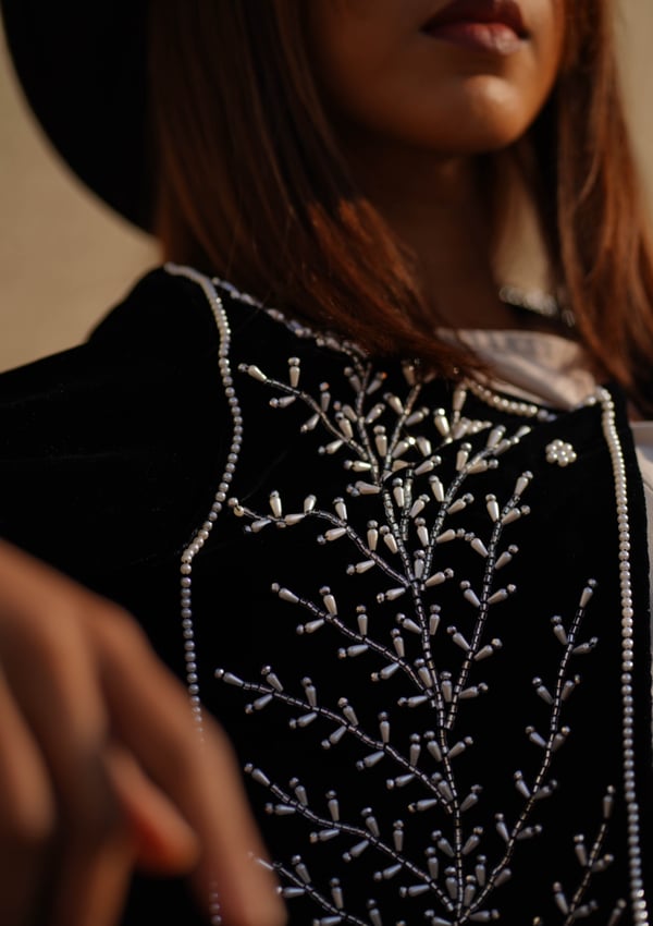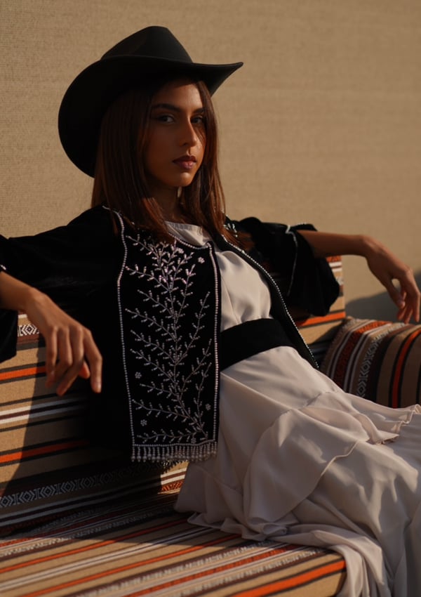 Off white Chiffon caftan paired with a black velvet crepe jacket featuring handmade pearl embroidery