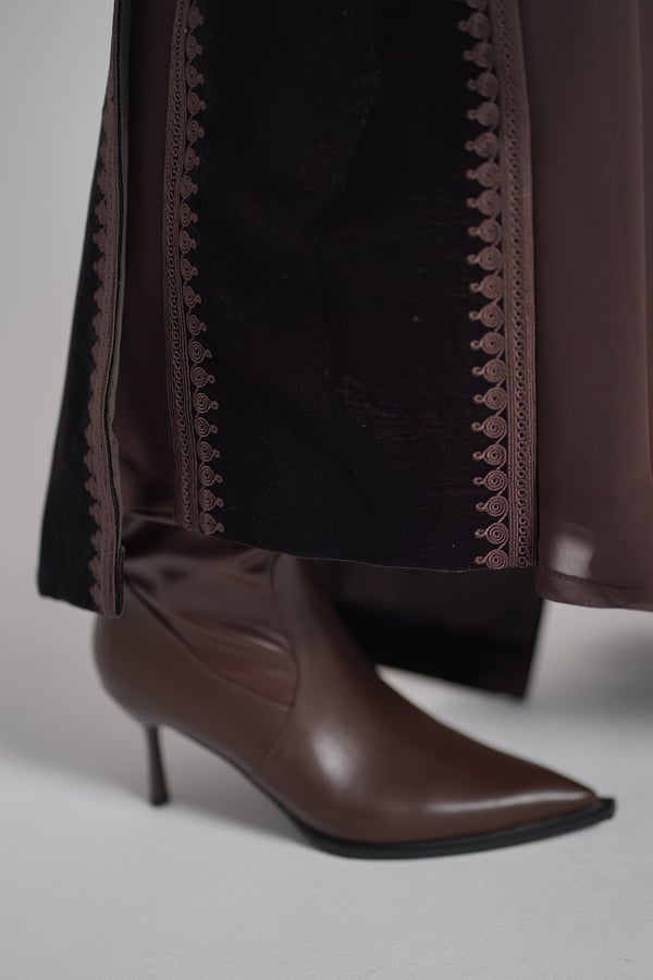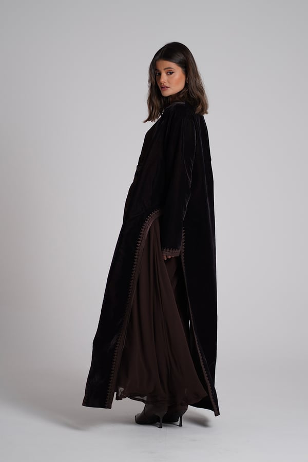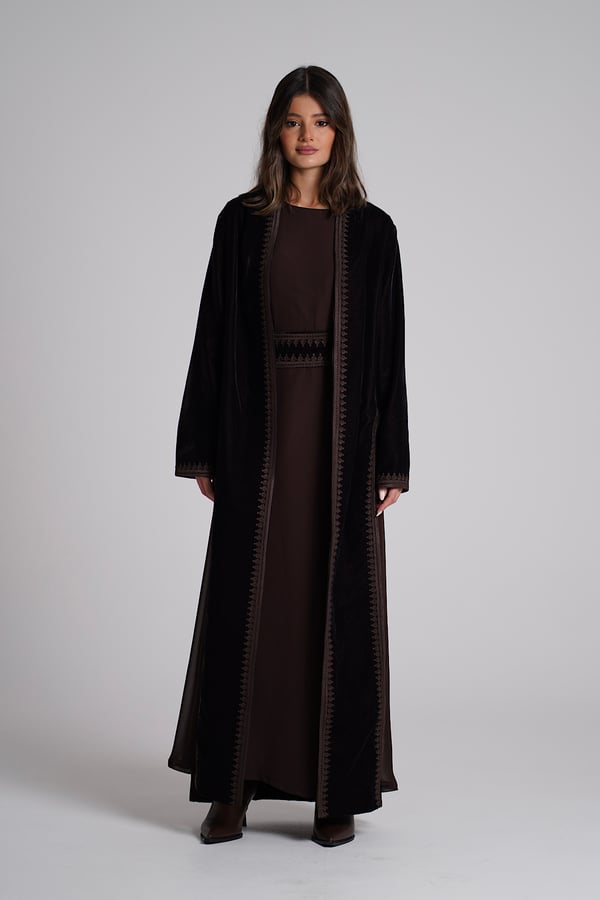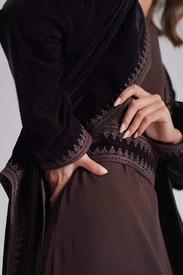 A velvet kaftan featuring traditional Moroccan-style embroidery, paired with a chiffon inner dress. The set comes in a rich brown color. The model is wearing size Small with a length of 55.