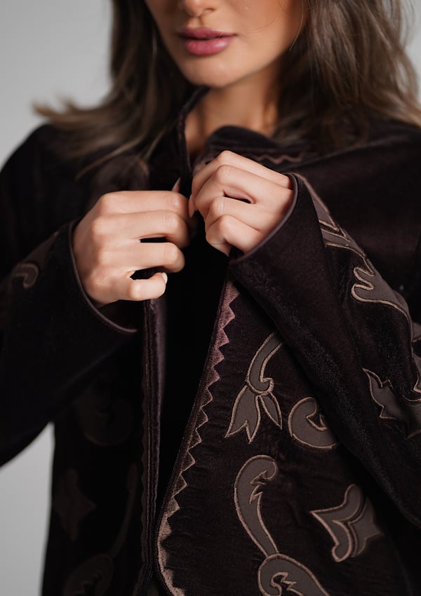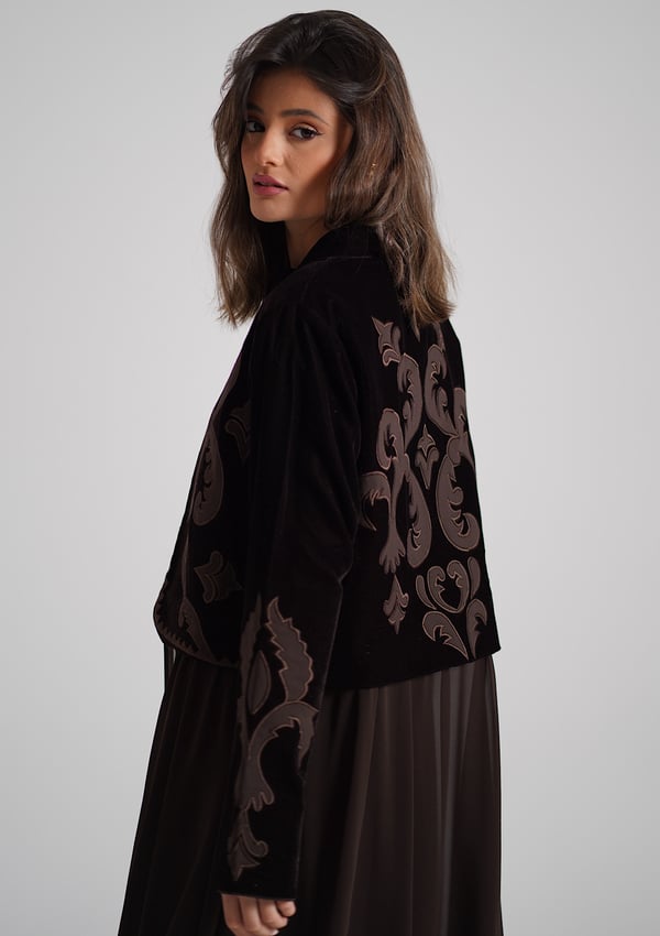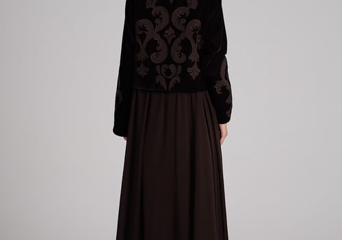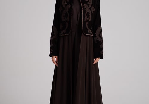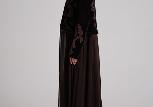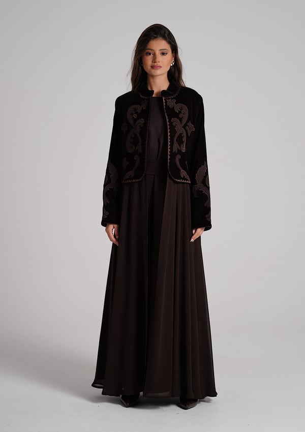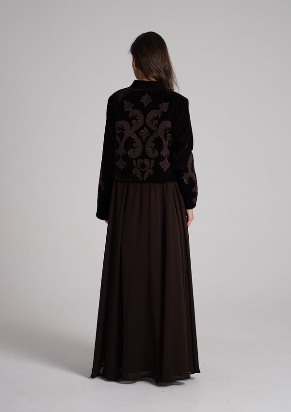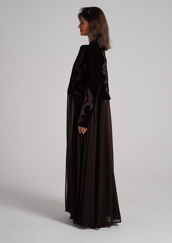 A kaftan featuring a brown embroidered velvet top with chiffon-trimmed edges, paired with a brown crepe skirt.