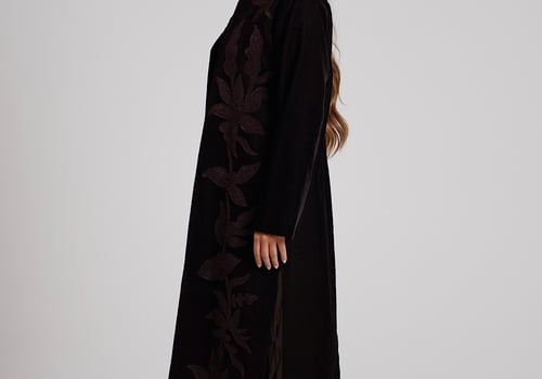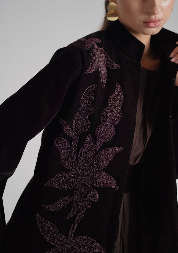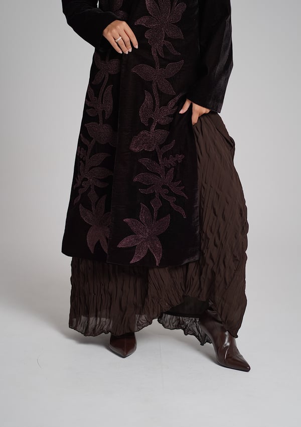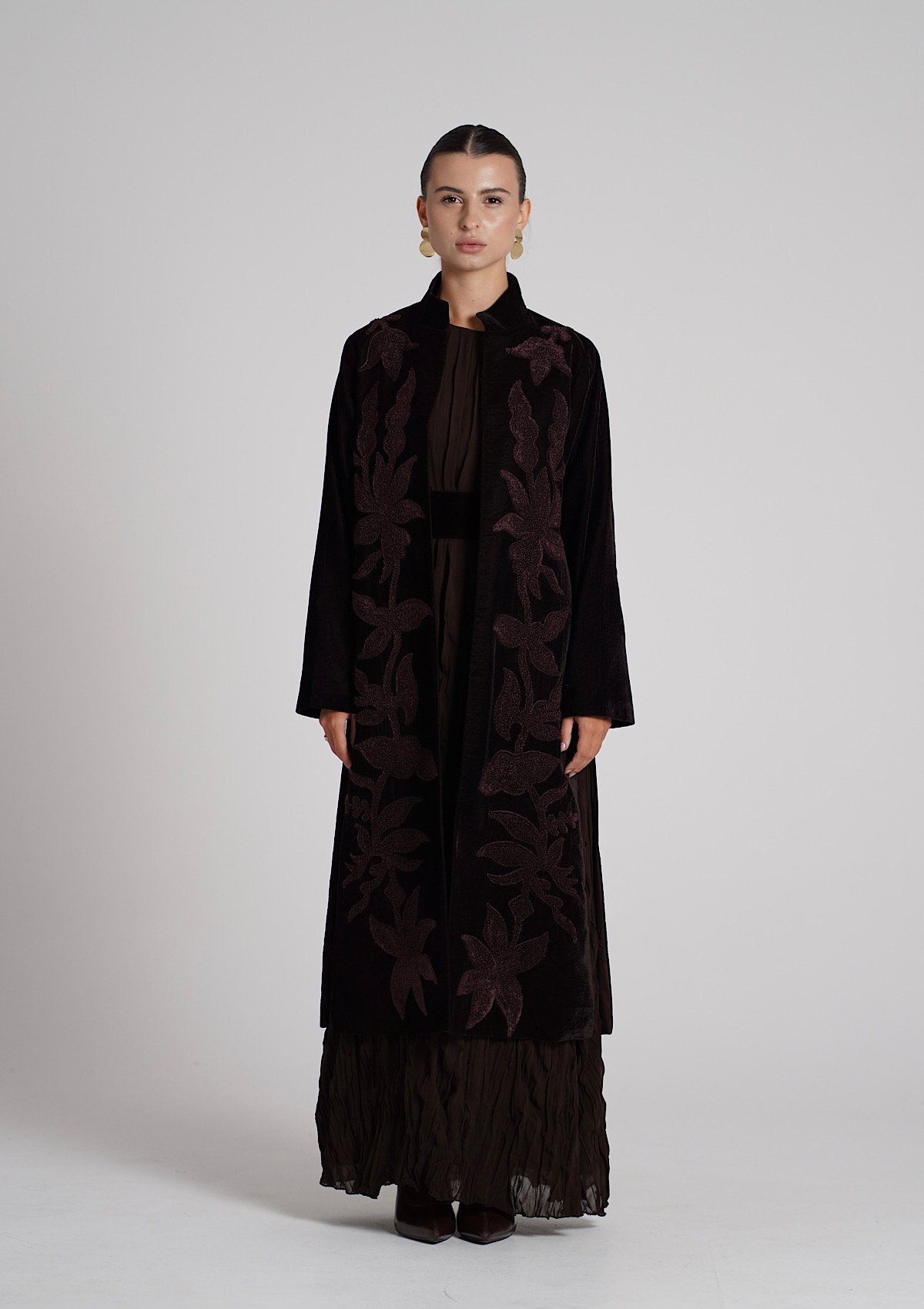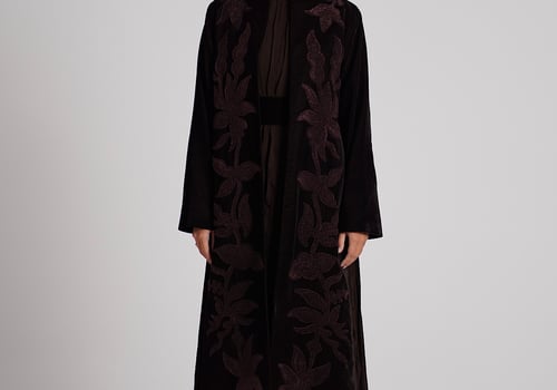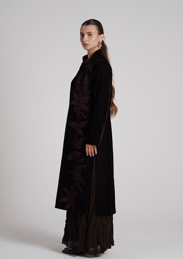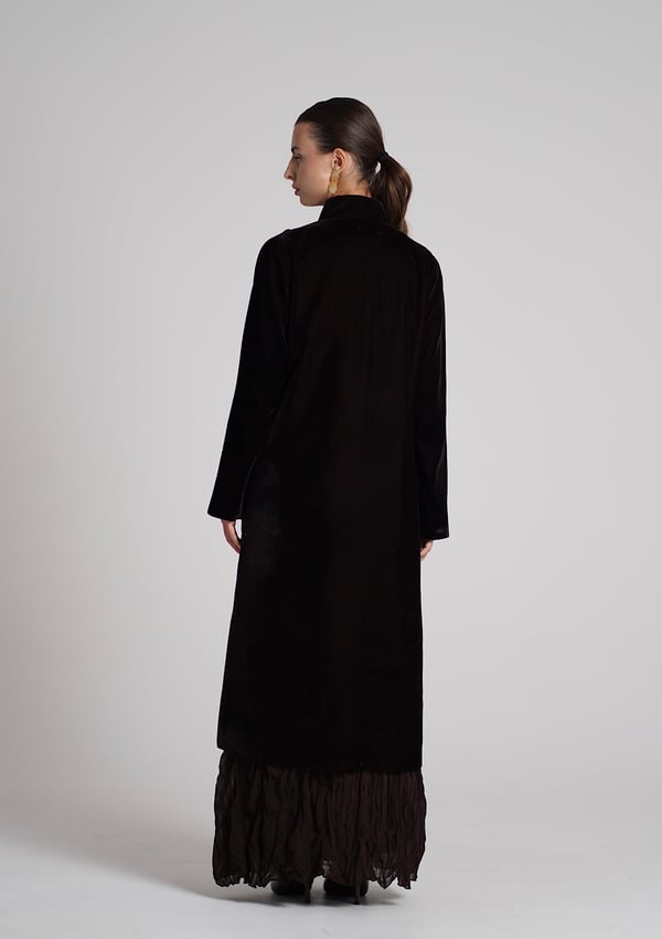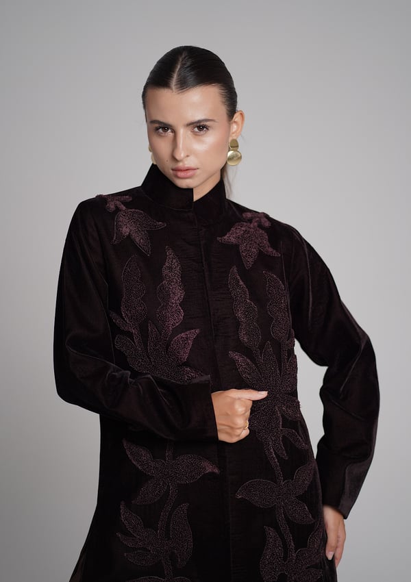 A brown velvet kaftan featuring traditio...