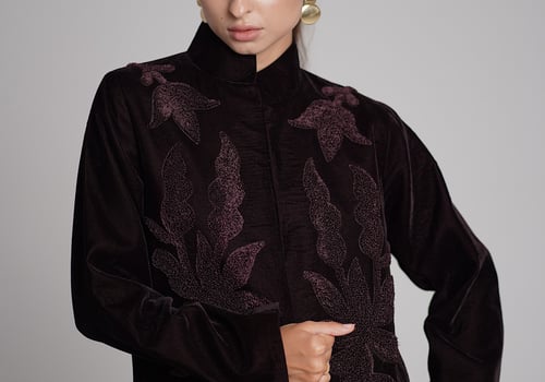 A purple velvet kaftan featuring traditi...