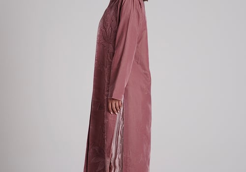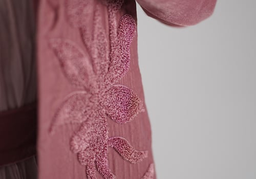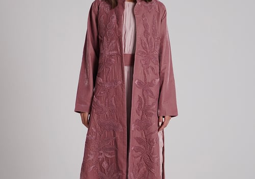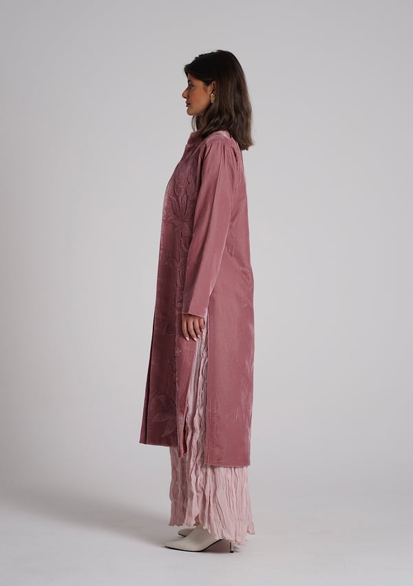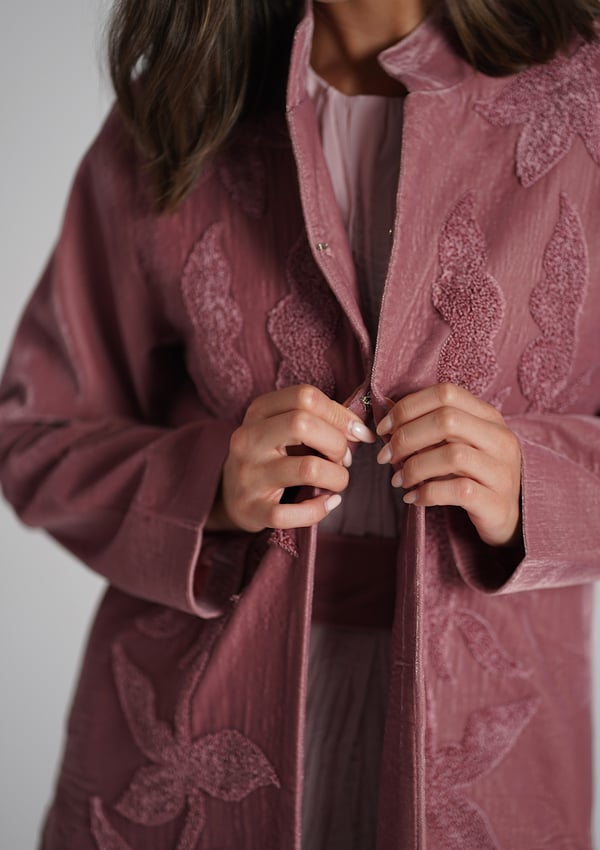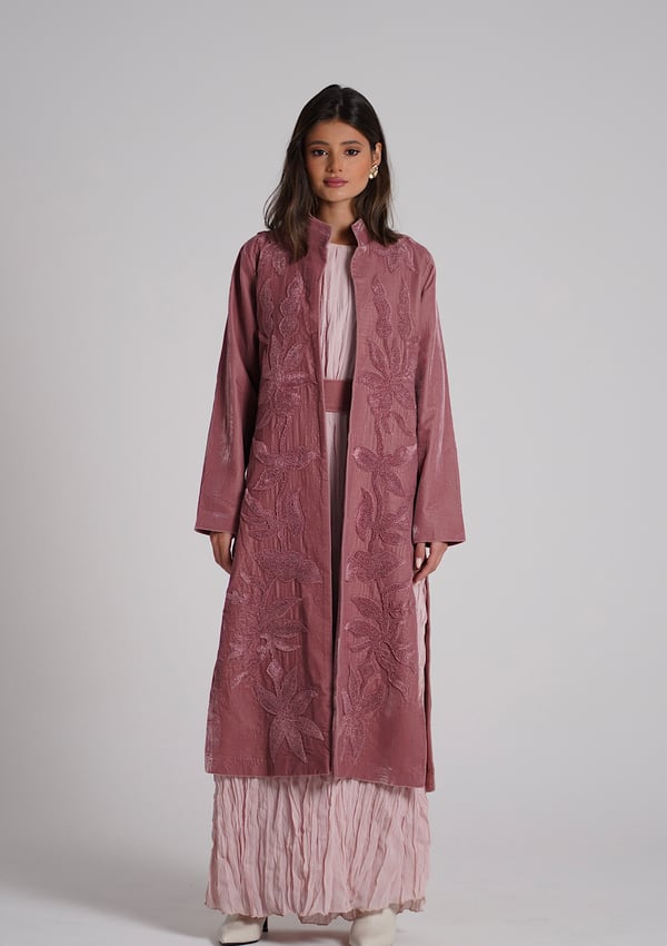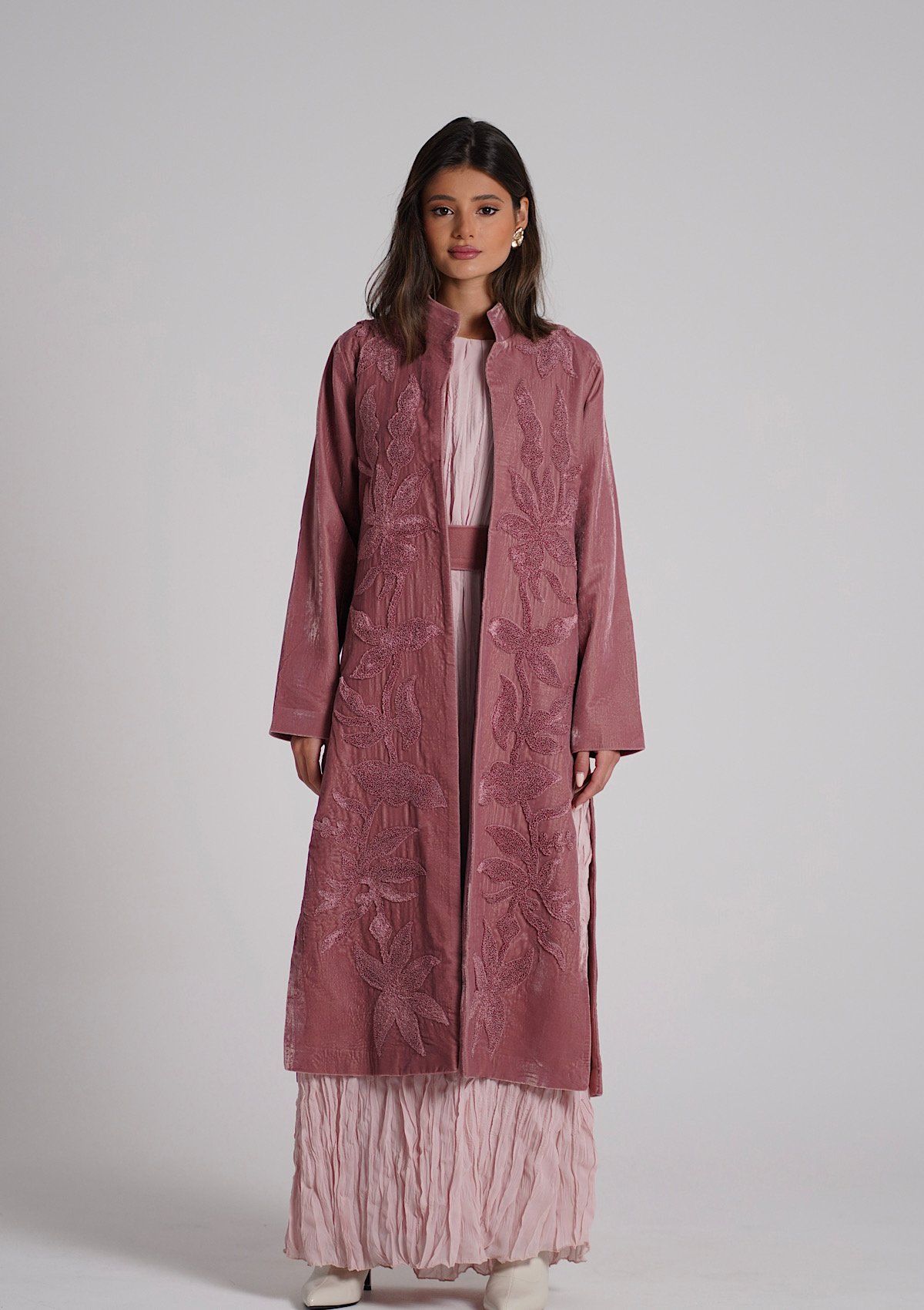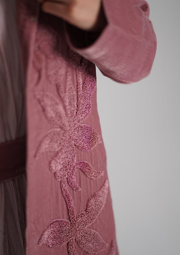 A velvet kaftan with 3D embroidery, paired with a crinkled chiffon inner dress — both in a soft pink color. The model is wearing size Small with a length of 55.